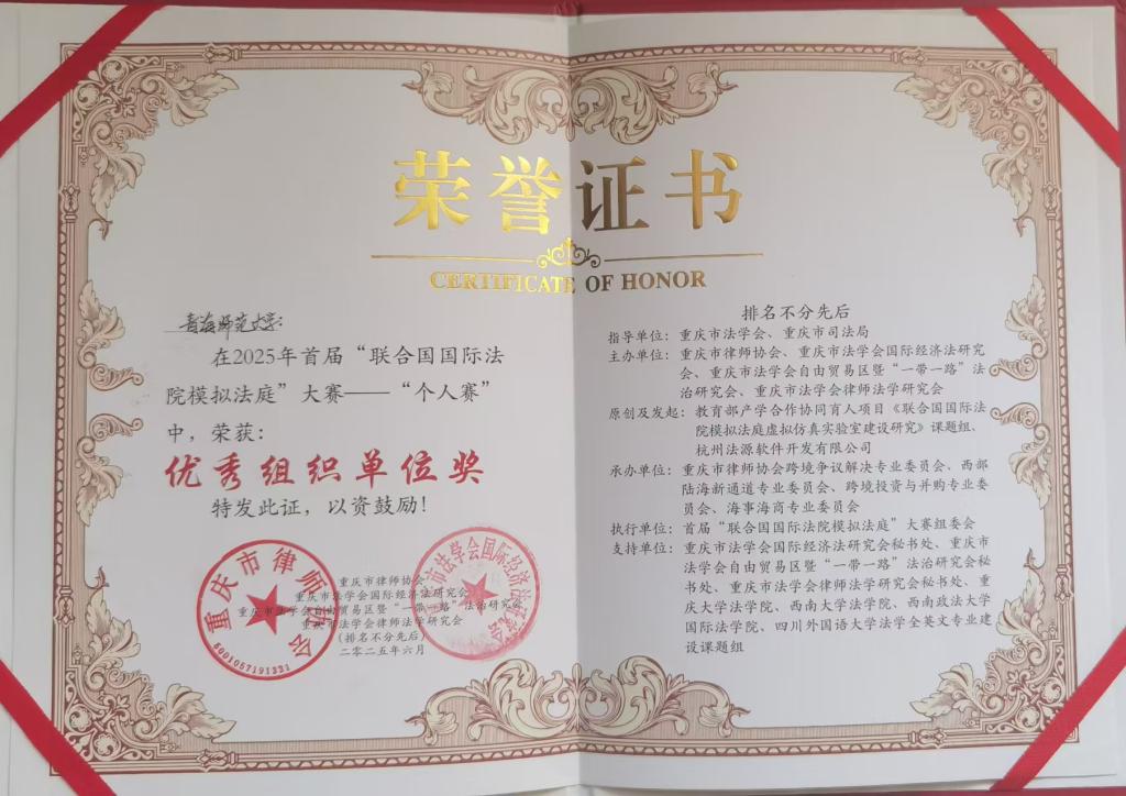 近日,由重庆市司法局、重庆市法学会指导,重庆市律师协会、重庆市法学会国际经济法研究会、重庆市法学会自由贸易区暨“一带一路”法治研究会、重庆市法学会律师法学研究会联合主办的2025年首届“联合国国际法院模拟法庭”大赛个人赛圆满落幕。
