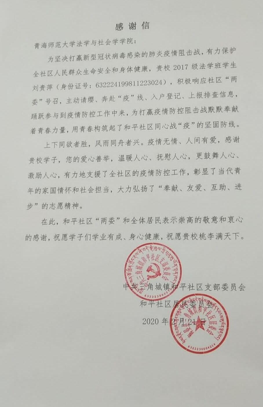 信中写道:疫情发生之后,刘贵萍同学主动奔赴“疫”线、入户登记、上报排查信息,为打赢疫情防控阻击战默默奉献着青春力量,用青春构筑起和平社区同心战“疫”的坚固防线。上下同欲者胜,风雨同舟者兴。疫情无情、人间有爱,感谢贵校学子。您的爱心善举,温暖人心、抚慰人心,更鼓舞人心,激励人心。有力地支援了全社区的疫情防控工作,彰显了当代青年的家国情怀和社会担当,大力弘扬了“奉献、友爱、互助、进步”的志愿精神。