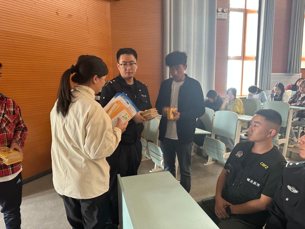 杨文峰大队长从防范传销、非法集资和合同诈骗三个方面,向同学们介绍了新的电诈手段,通过真实案件和涉及学生骗术类型的讲解给大家给予了深刻的警醒和启示,引导教育同学们从案件中汲取教训,增强防范意识,保护自身安全。桓之海副大队长从什么是电信网络诈骗、电信网络诈骗的常见类型、买卖个人电话卡和银行账户的危害,如何才能防止被骗等多个视角出发,以大量真实鲜活的案例警示同学们对各类信息“擦亮眼”,警惕手机短信和不明链接的诈骗,要从正规渠道开展兼职、购物和相关社会活动,避免不必要的经济损失。任彭威警长为大家讲解了防盗、禁毒等方面的知识,呼吁同学们增强社会责任感,提高禁毒意识和防毒拒毒能力,做一名自觉遵纪守法、勤奋学习的新时代大学生。与会干警们还为同学们分发了防范电诈、防盗禁毒的宣传品。